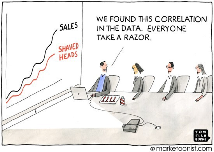 It’s easy to watch correlated data change in tandem and assume that one thing causes the other. That’s because our brains are wired for cause-relation cognitive bias. We need to make sense of large amounts of incoming data, so our brain simplifies it. This process is called heuristics, and it’s often useful and accurate. But not always. An example of where heuristics goes wrong is whenever you believe that correlation implies causation.